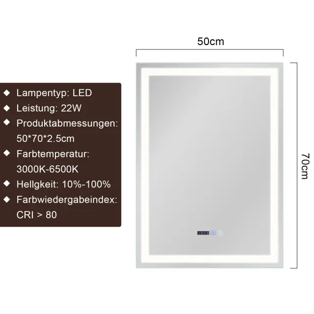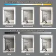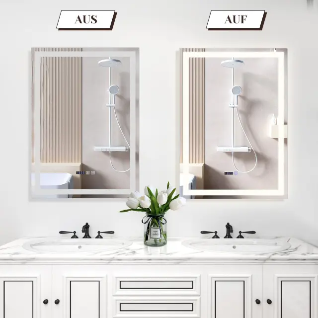 Nastavljiva svetloba: To kopalniško ogledalo ima funkcijo dotiknega zatemnjevanja. S kratkim pritiskom na stikalo izberete želeno barvno temperaturo svetlobe med toplo belo, nevtralno belo in hladno belo (3.000 K do 6.500 K) za različne potrebe. Z dolgim pritiskom enostavno uravnavate svetilnost od 10 % do 100 %. Z nadaljnjim dolgim pritiskom natančno nastavite svetlost od nizke do visoke.