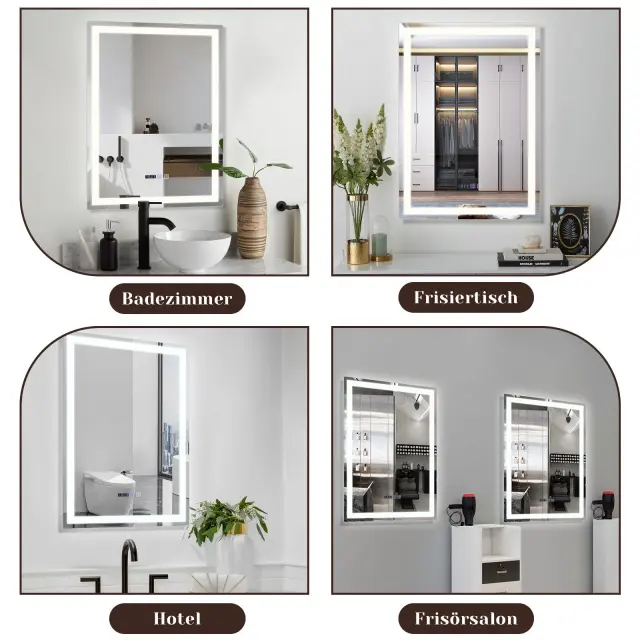 Kopalniško ogledalo z osvetlitvijo: Sodoben dizajn in napredne funkcionalnosti združujeta to kopalniško ogledalo z dotikovimi nastavitvami za zatemnitev, nadzor svetlosti in razgubljevalnik megle za vašo vsakodnevno udobnost. Prilagodite si popolno svetlobno izkušnjo.
