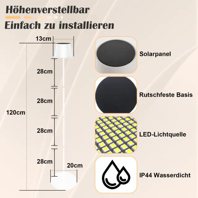 Izjemna življenjska doba: Naš brezžični stebrni svetilnik je izdelan iz robustnega železa in visokokakovostnega polipropilena, odporen na rjo in vremenske vplive. S stopnjo zaščite IP44 je primeren za uporabo v zaprtih prostorih, pa tudi na vrtu, terasi in balkonu.