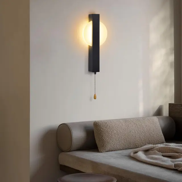 Drsno stikalo: Na dnu stenske svetilke se nahaja elegantno drsno stikalo iz kovine z gladko in elegantno površino, enostavno za uporabo. Zaobljen lesen konec na njegovem koncu zagotavlja udoben oprijem in v dizajn prinaša naravno toplino. Hladna eleganca kovine in topla lesena tekstura ustvarjata popolno ravnovesje, ki omogoča vklop in izklop svetlobe z enim pritiskom.