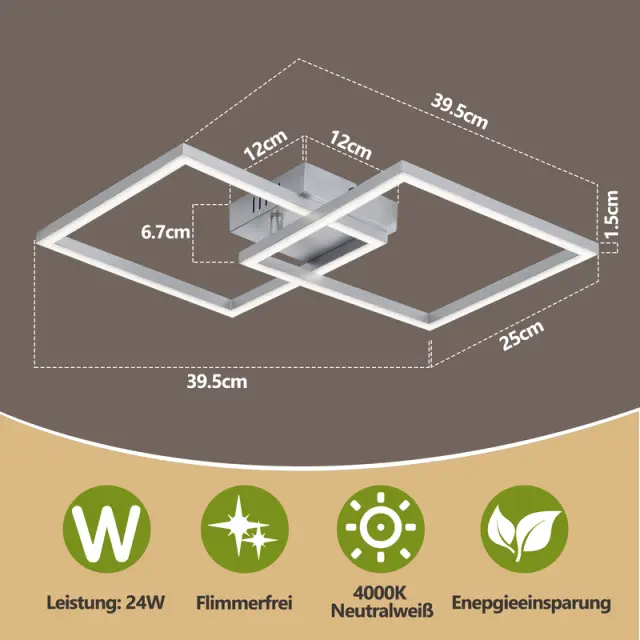 Tehnične značilnosti: Ta srebrna stropna luč meri 39,5 x 39,5 x 6,7 cm in uporablja 24 W žarnico (ni zatemnljiva). Ima indeks barvnega podajanja (IRC) > 80 za zvesto podajo barv. Zaščita IP20 omogoča varno notranjo uporabo pri 230 V.