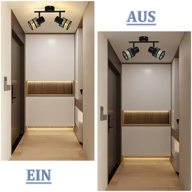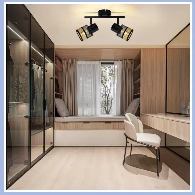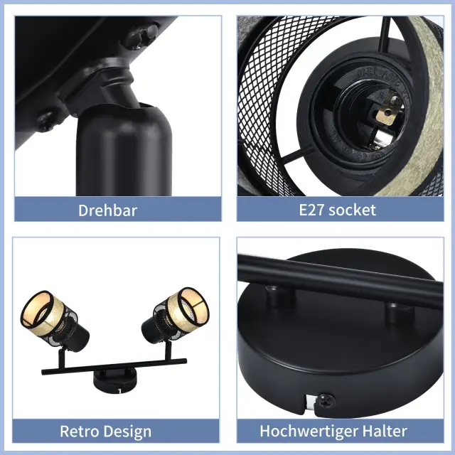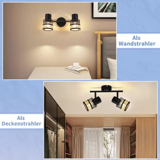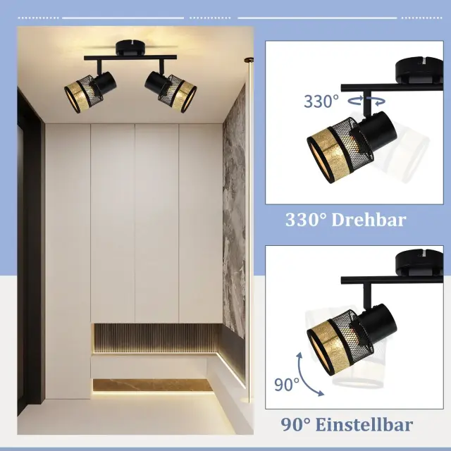NETTLIFE Stropna svetilka z 2 reflektorjema, max 25W, kovinska, E27, črna, vintage, za hodnik, 330 z zlatim senčnikom iz blaga