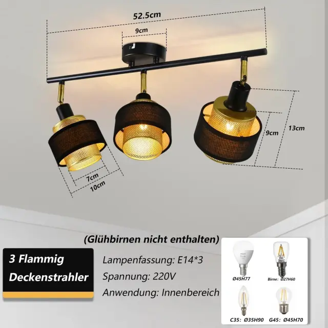 NETTLIFE stropna svetilka s 3 reflektorji, E14, črna, vintage, s plamenom, retro