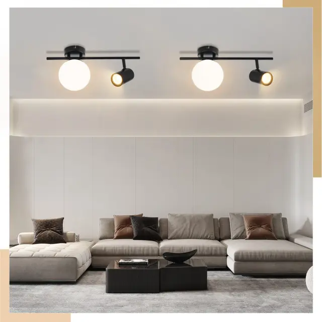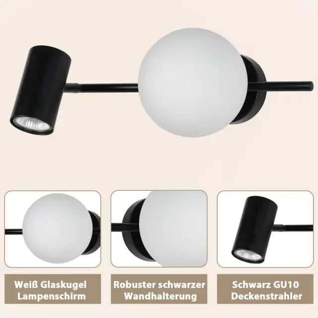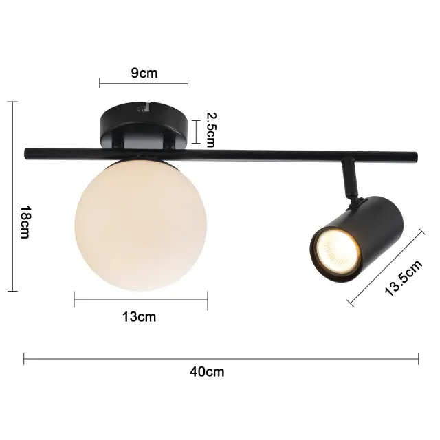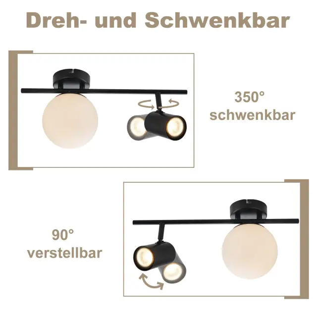 NETTLIFE stropna svetilka z 2 plamenoma, črna, moderna stropna svetilka z GU10, vrtljiva, 40 cm, kovinska, steklena krogla, E14