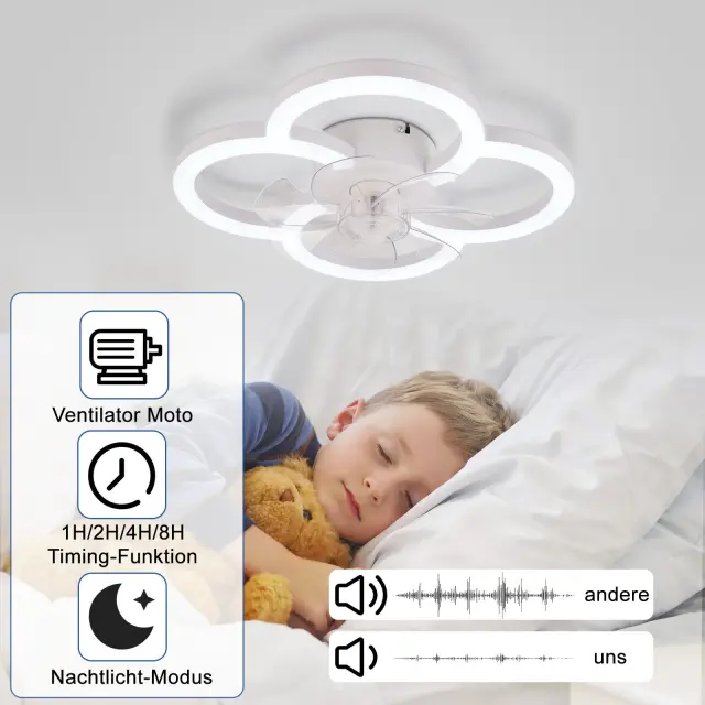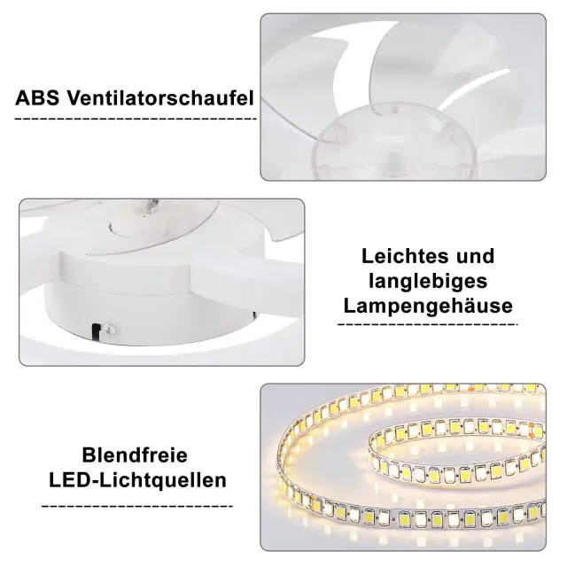 Večnamenski stropni ventilator s svetlobo: ta ventilator s svetlobo omogoča nastavitev svetlosti od 10 % do 100 % in barvne temperature (3000 K – 6500 K). Na voljo je 6 hitrosti vetra, časovnik za 2/4 ure in nočni način. Svetlobo in hitrost vetra lahko prilagodite po potrebah, kar vam omogoča sproščenost med delom ali zabavo.