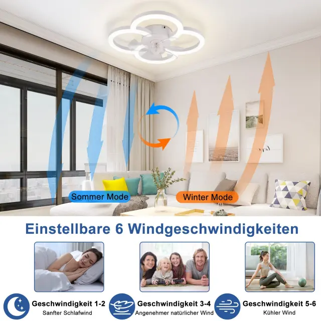 Moderen dizajn: ta LED stropna svetilka s ventilatorjem ima elegantno obliko metulja in edinstven sodoben stil, ki ne le ustvarja posebno vzdušje v vaši dnevni sobi ali spalnici, temveč tudi dodatno okrasi vaš dom. Poleg tega je LED stropna svetilka sestavljena iz visokokakovostnih LED čipov z visoko prepustnostjo svetlobe in brez utripanja, kar zagotavlja enakomerno in mehko osvetlitev, ki bolje ščiti vaše oči in oči vaših družinskih članov.