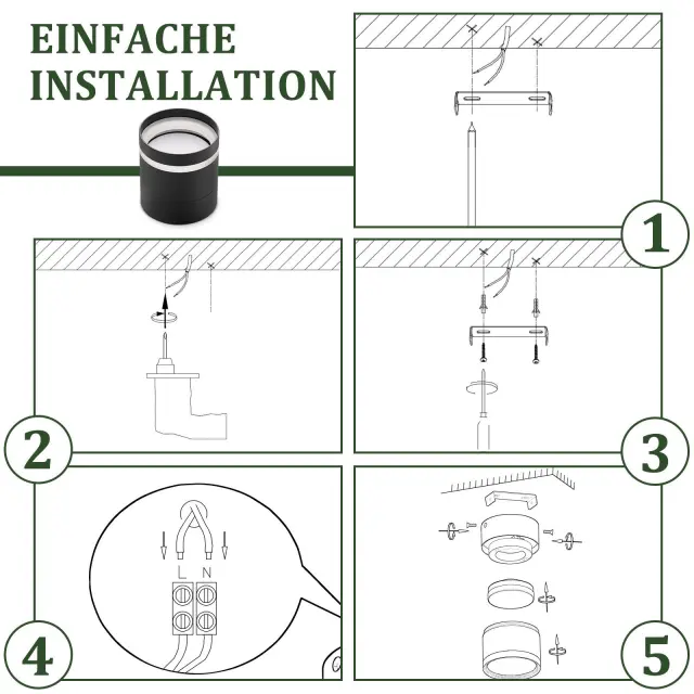 Enostavna namestitev: Ta stropna svetilka, idealna za tesne prostore, je praktična alternativa vgradnim svetilkam. Priključek 230 V ne zahteva transformatorja. Z višino 8,5 cm in širino 9,5 cm je vgradna svetilka enostavna za namestitev: preprosto priključite kable in privijte vijake.