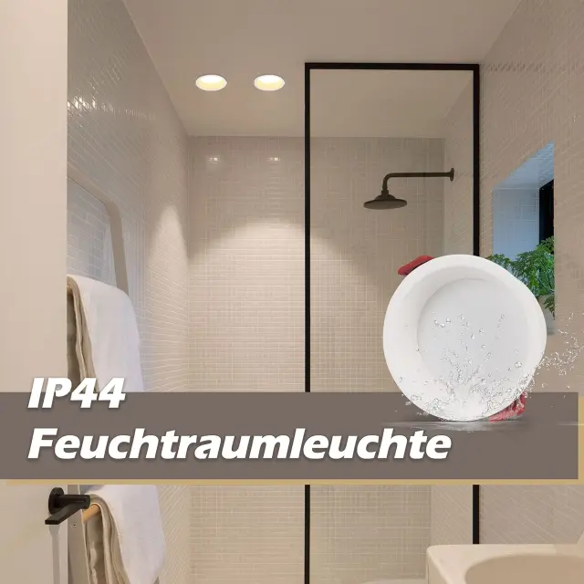 Svetiljka za mokre prostore IP44: Z zaščito IP44 je vgradni LED reflektor svetlobni predmet, ki se lahko odlično uporablja v kopalnicah in drugih mokrih prostorih, saj je dovolj zaščiten pred vdorom umazanije in brizganjem vode.
