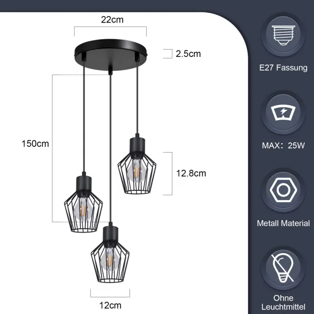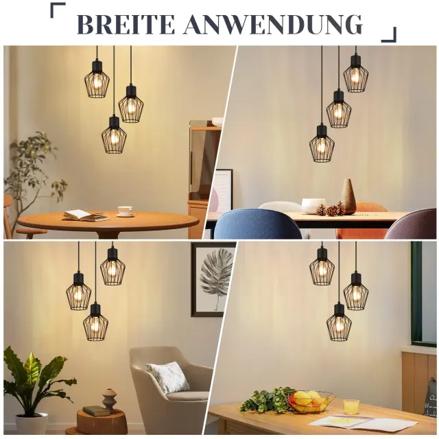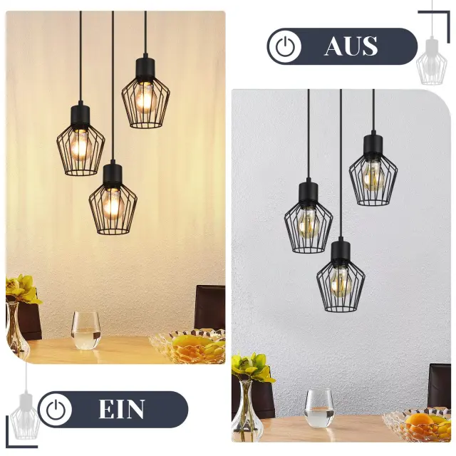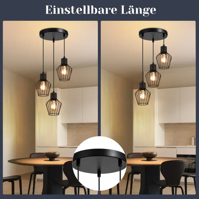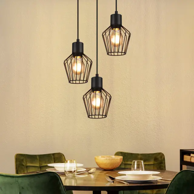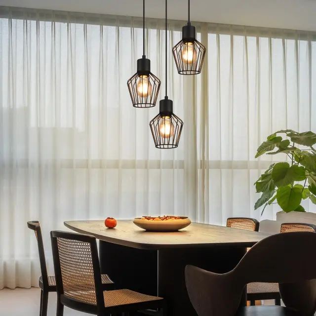 [Modna razsvetljava] Ta kovinska viseča svetilka za jedilno mizo s 3 lučkami je v črni barvi in sprejme žarnico E27, idealna za osvetlitev nad jedilno mizo. [Dekorativna oblika] Ta črna viseča svetilka ima edinstven valoviti vzorec in črne senčnike, ki vaši jedilnici dodajo starinski pridih, hkrati pa zagotavljajo praktično svetlobo. [Enostavna namestitev] Opremljena s stropnim pokrovom, jo je mogoče hitro in enostavno namestiti s standardnimi žicami, brez posebnega orodja ali modifikacij. [Trdna konstrukcija] Kuhinjska viseča svetilka je izdelana iz visokokakovostne kovine in materialov z izjemno izdelavo, zato je ta svetilka za dnevno sobo viseča, vzdržljiva in robustna. [Združljiva s standardnim svetlobnim virom] Ta viseča svetilka za hodnik je združljiva z vtičnico E27 (svetlobni vir ni priložen), tako da lahko izberete ustrezno žarnico in moč glede na svoje potrebe.