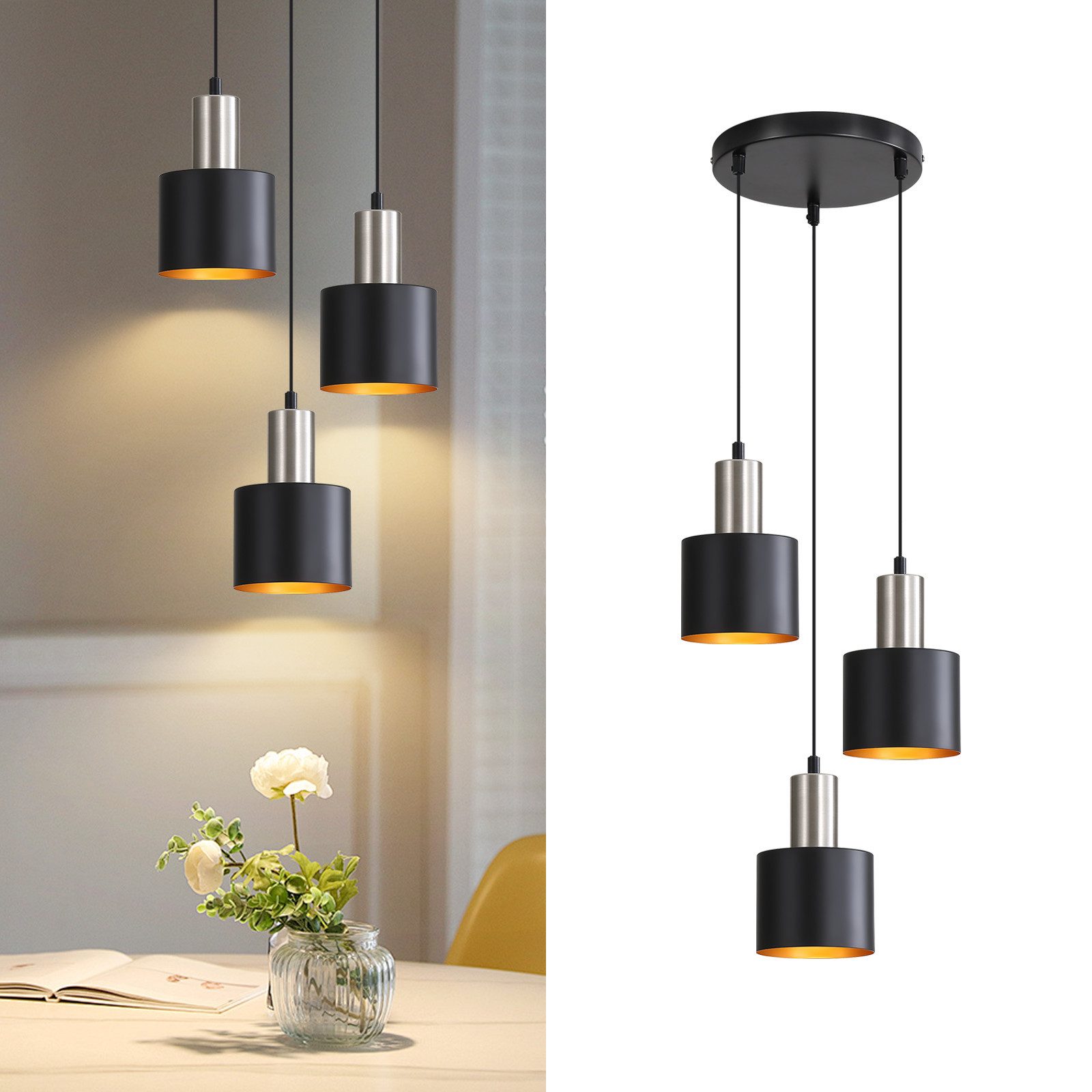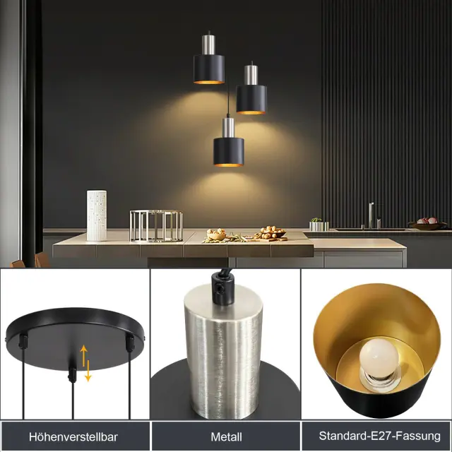 【Retro industrijski slog】 S svojim retro industrijskim slogom je ta viseča svetilka e27 odlično dopolnilo moderni, vintage ali loft notranjosti. Klasični valjasti senčnik in kovinska oblika dajeta vsakemu prostoru značilen pridih. Viseče svetilke za dnevno sobo imajo črno površino in so znotraj pobarvane v zlato barvo, kar daje jedilni svetilki eleganten videz.