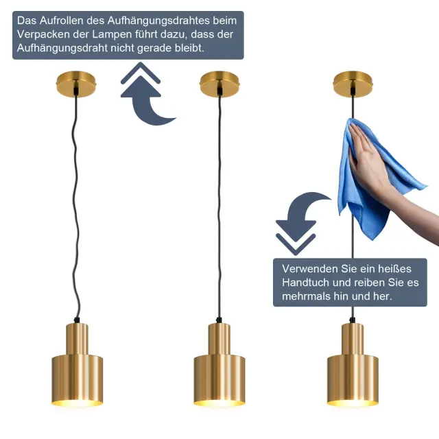 Ko je pakirana, je lahko viseča svetilka v starinskem zlatu nekoliko upognjena, vendar to ne vpliva na njeno lepoto. Po namestitvi lahko gladkost povrnete z nežnim drgnjenjem s toplo brisačo, kar kaže na pozornost do detajlov. Zlati lestenec odseva napeto žico pod lučjo, kar odlično dopolnjuje namen svetilke.