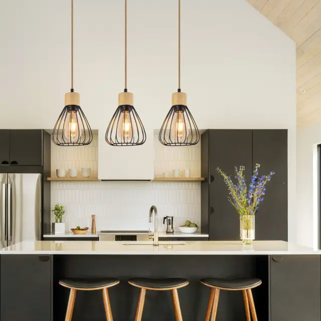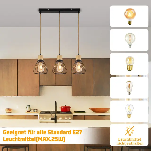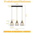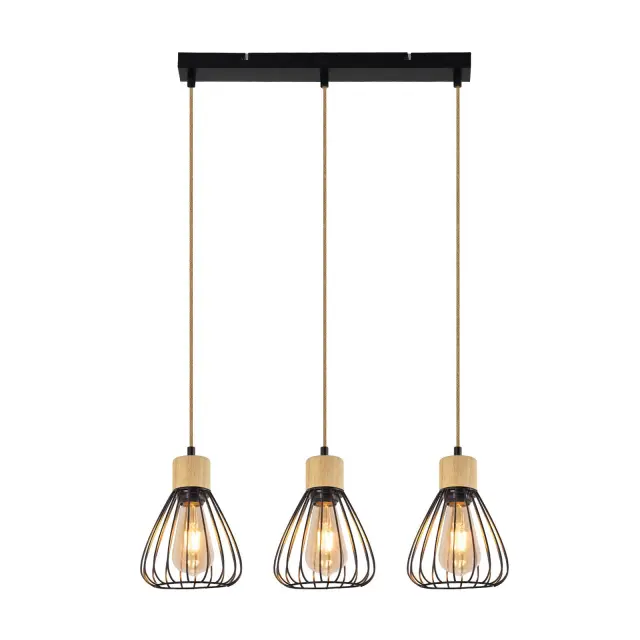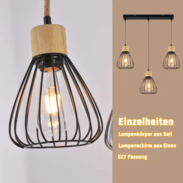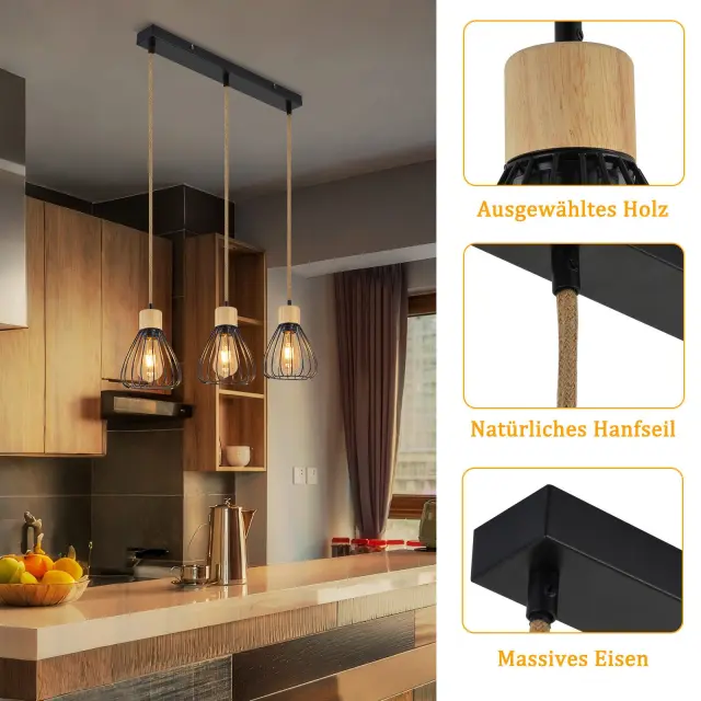 NETTLIFE viseča svetilka, vintage industrijska retro lesena in kovinska črna viseča svetilka s konopljino vrvjo s 3 plameni E27