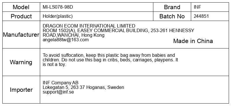 Da se izognete zadušitvi, hranite to plastično vrečko stran od dojenčkov in otrok. Te vrečke ne uporabljajte v zibelkah, posteljah, vozičkih, stajicah. To ni igrača.