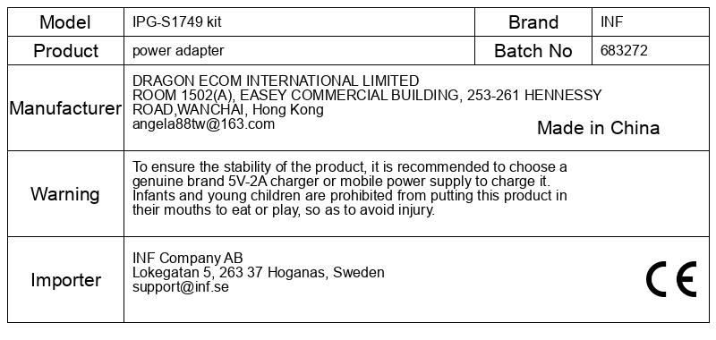 Za zagotovitev stabilnosti izdelka je priporočljivo, da za polnjenje izberete originalni polnilnik 5V-2A znamke ali mobilni napajalnik. Dojenčkom in majhnim otrokom je prepovedano dajati ta izdelek v usta, da bi jedli ali se igrali, da se izognete poškodbam.