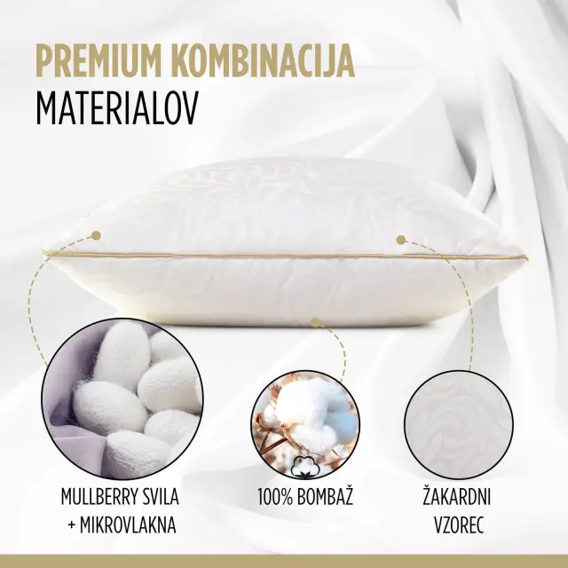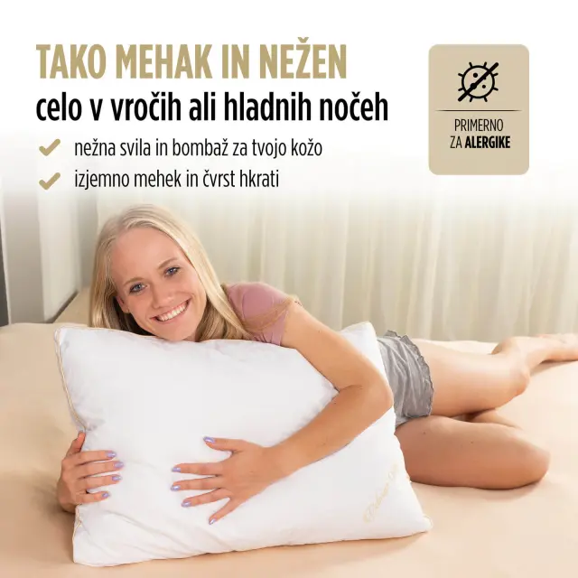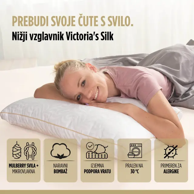 Nižji svileni vzglavnik Victoria's Silk ti nudi razkošno udobje v vsaki minuti tvojih noči. Z najkakovostnejšo svilo na svetu - mulberry svilo, ki se naravno prilagaja temperaturnim spremembam in nudi zračnost. Nižji vzglavnik je odlična izbira za vse, ki radi spite na trebuhu, ali vse z ožjimi rameni. Razkošno polnilo nudi odlično podporo tvojim vratnim vretencem, da se lahko prebujaš z več energije in se posloviš od bolečin v vratu.