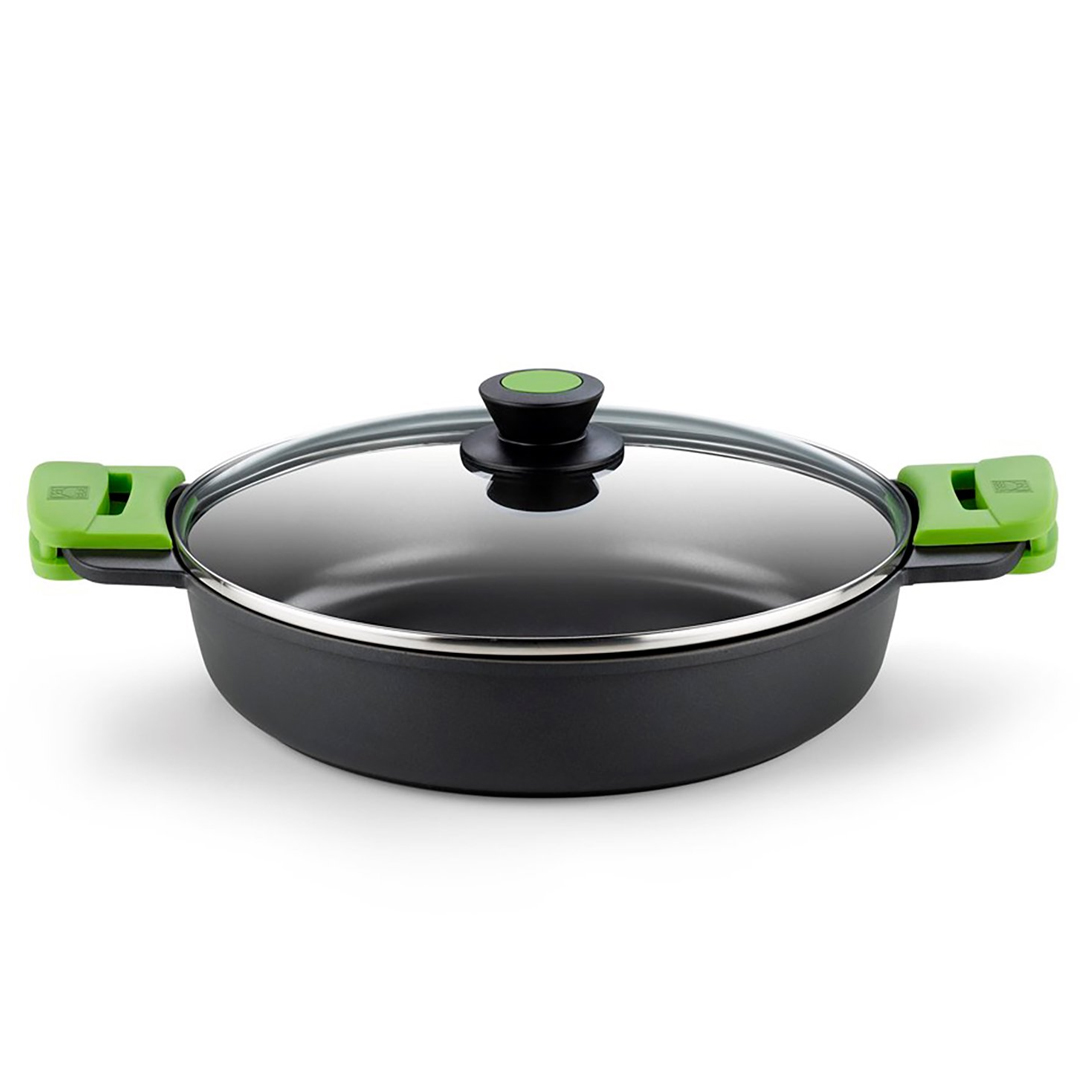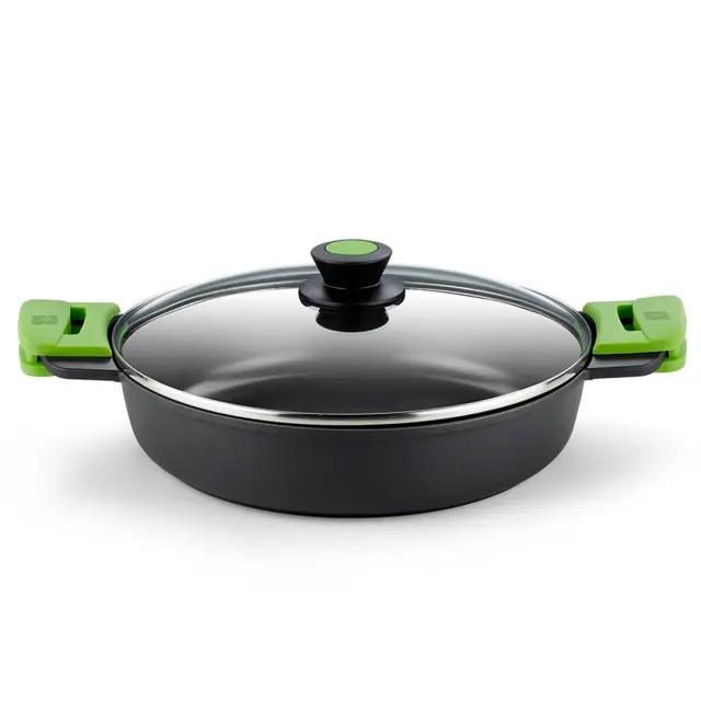 Lahko jo uporabite na vseh kuhalnih površinah, saj zagotavlja odlično porazdelitev temperature. Opremljena je še s steklenim pokrovom z robustnim ročajem in dvema zelenima silikonskima prijemalkama, ki omogočata enostavno rokovanje.