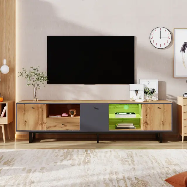 Nizka TV omarica z LED osvetlitvijo, stekleno pregrado, odbijačem, barvno usklajenim dizajnom