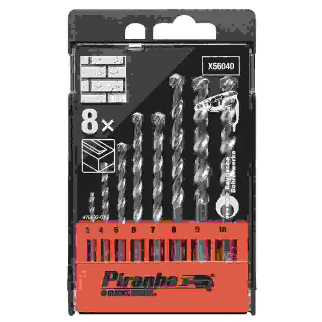 X56040 je 8-delni set Piranha svedrov (svedri za zid / opeko) znamke Black Decker / Piranha. Set vsebuje najpogosteje uporabljene premere za vrtanje v opeko, hišno opeko in lahki beton. Vsak sveder ima trdno tungsten carbide (karbidno) konico, ki zagotavlja hitro in učinkovito vrtanje ter dolgo življenjsko dobo. Vsebina seta (premeri): 3 mm, 4 mm, 5 mm, 6 mm, 7 mm, 8 mm, 9 mm, 10 mm Glavne značilnosti: Karbidna konica za visoko vzdržljivost in dobro rezalno zmogljivost Primerni za navadne ročne vrtalnike (niso za SDS kladivne vrtalnike) Praktična plastična kaseta za pregledno shranjevanje in prenašanje Odlično odvajanje prahu med vrtanjem Idealni za profesionalno in domačo uporabo Ta set je odlična izbira za zidarje, monterje, serviserje in domače mojstre, ki potrebujejo komplet svedrov za zidarska dela po ugodni ceni.