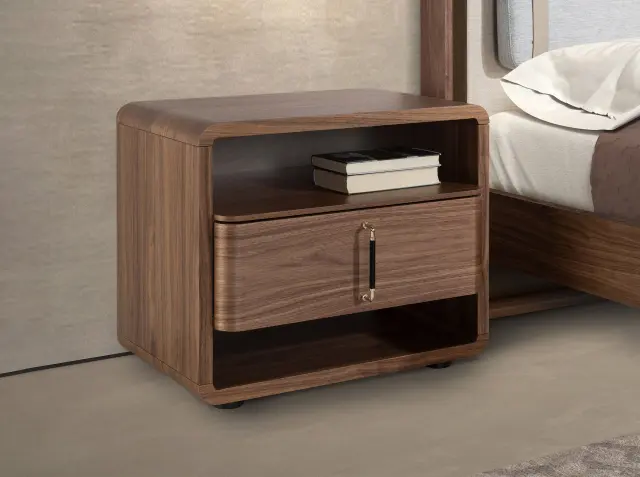 Nočna omarica sodobnega dizajna s konstrukcijo iz naravnega orehovega furnirja in originalnimi nogami iz črnega PVC. Ima prostoren prostor za shranjevanje z 1 predalom z odpiranjem na jezičasti ročaj in sistemom mehkega zapiranja.