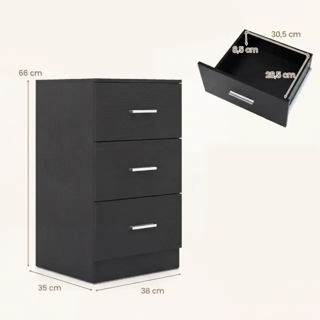 3 gladko drsni predali: Nočna omarica s 3 predali ima kovinska vodila za gladko in tiho delovanje ob vsakem dostopu do nje. Knjige, zdravila, očala in osebne predmete imejte lepo urejene in dosegljive v teh prostornih predalih.