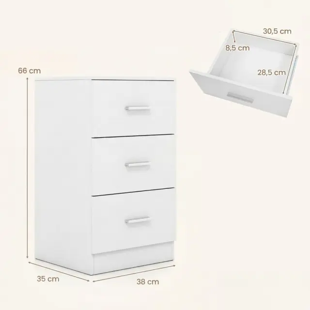 3 gladko drsni predali: Nočna omarica s 3 predali je opremljena s kovinskimi vodili za gladko in tiho delovanje ob vsakem dostopu do nje. Knjige, zdravila, očala in osebne predmete imejte lepo urejene in dosegljive v teh prostornih predalih.