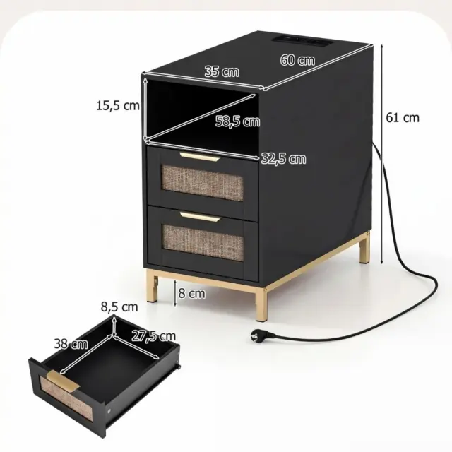 Vgrajena polnilna postaja: nočna omarica iz ratana ima vgrajeno polnilno postajo z dvema vtičnicama za izmenični tok (230 V/10 A), priključkom USB-A (5 V/2,4 A), priključkom USB-C (5 V/2,4 A) in 1,4 m dolgim napajalnim kablom. Tako bodo vaše naprave vedno napolnjene brez zapletenih kablov.