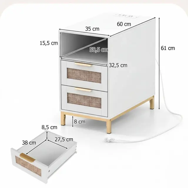 Vgrajena polnilna postaja: nočna omarica iz ratana ima vgrajeno polnilno postajo z dvema AC vtičnicama (230 V/10A), priključkom USB-A (5 V/2,4 A), priključkom USB-C (5 V/2,4 A) in 1,4 m dolgim napajalnim kablom. Tako bodo vaše naprave vedno napolnjene brez zapletenih kablov.