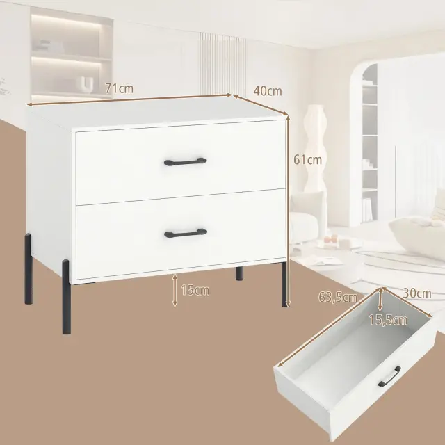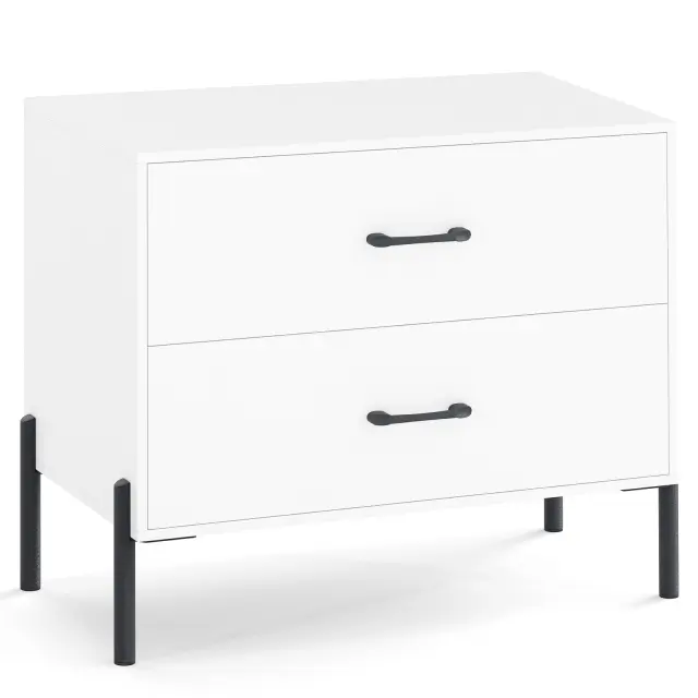 S prostorno delovno površino in dvema velikima predaloma je ta sodobni organizator kot nalašč za shranjevanje pijač, prigrizkov, telefonov, revij in okraskov. Ta nočna omarica, ki jo podpirajo trpežne kovinske noge s 15 cm visokim prostorom za lažje čiščenje, združuje vzdržljivost in priročnost. Gladki izvleki predalov in kompleti proti nagibanju zagotavljajo brezskrbno uporabo in varnost. Zaradi elegantne, minimalistične zasnove je ta stranska mizica z dvema predaloma popoln dodatek za spalnico, pisarno ali sobo v študentskem domu, saj združuje organizacijo s slogom.