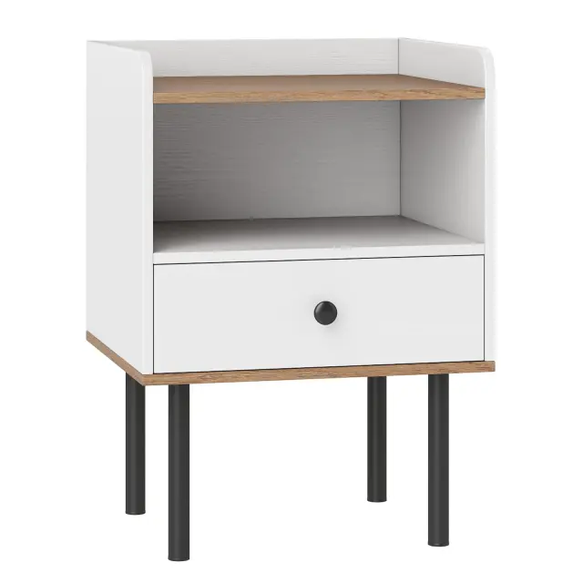 S to nočno omarico izboljšajte funkcionalnost in eleganco svojega bivalnega prostora! Izvlečni predal ponuja diskretno shrambo za vsakodnevne potrebščine, medtem ko prostorna polica in odprt predal nudita dovolj prostora za knjige in okraske. Stranska mizica, ki stoji na dvignjenih kovinskih nogah, zagotavlja odlično stabilnost in omogoča enostavno čiščenje pod njo. Ta kos pohištva, ki je odličen ob postelji ali kot elegantna stranska mizica v dnevni sobi, združuje funkcionalnost in sodoben dizajn.