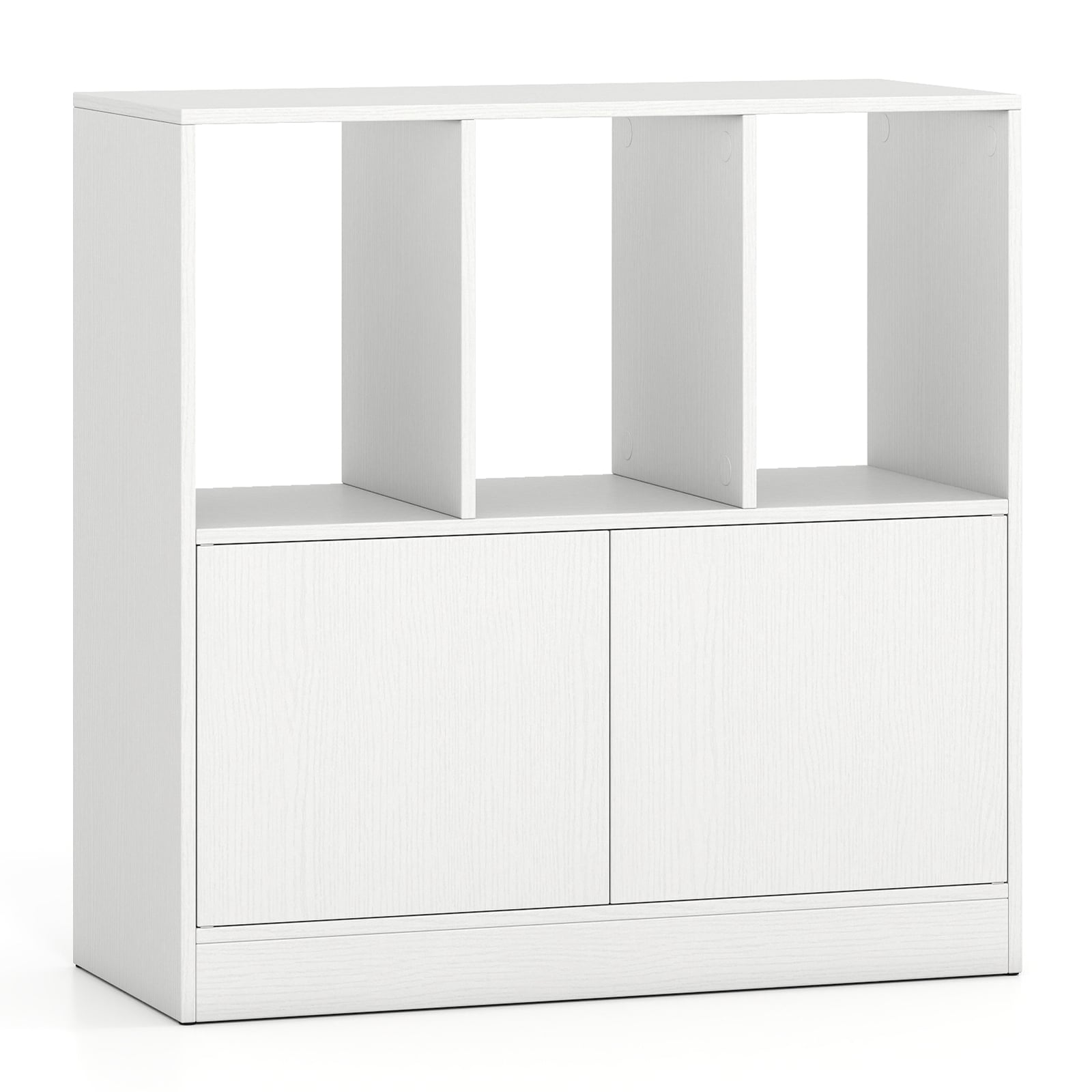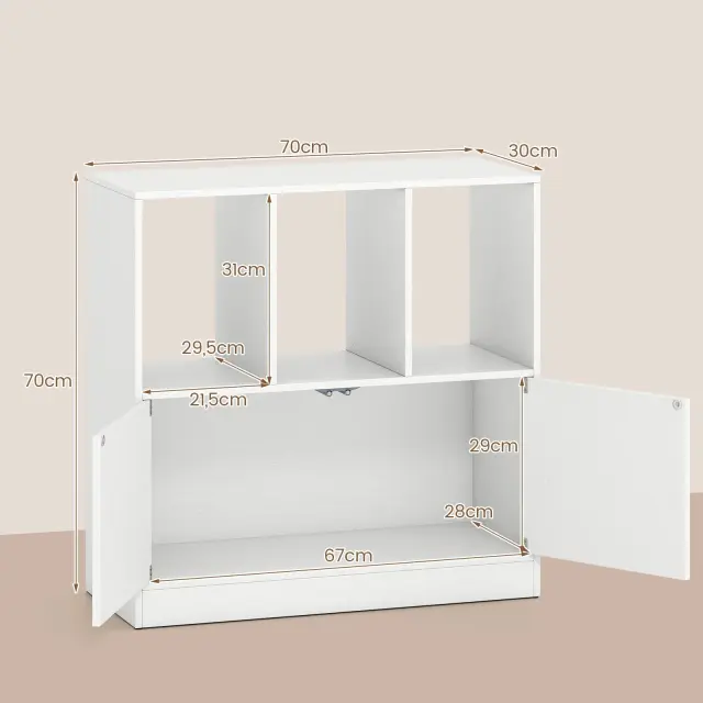 Odprto in zaprto shranjevanje: ta knjižna polica ima 3 odprte predale za enostaven dostop do knjig ali okraskov ter 1 omarico za shranjevanje, da nered ne bo na očeh. Poleg tega široka zgornja površina dopolnjuje razstavni prostor.
