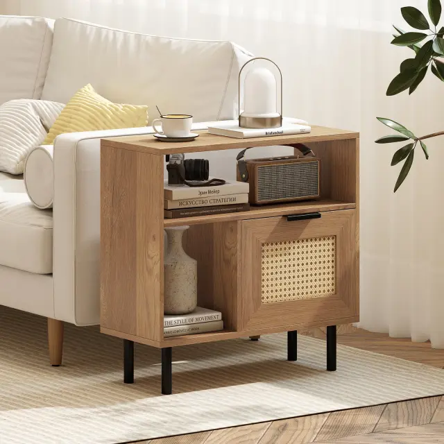 Rustikalna vrata iz ratana PE so odporna na svetlobo, trganje in brez vonja. Zaradi tega je stranska mizica še bolj privlačna. Večnamenska zasnova vključuje prostorno mizno ploščo, 2 odprti polici in skrito omarico - kot nalašč za urejeno shranjevanje knjig, pripomočkov in vsakdanjih predmetov. Miza, ki jo podpirajo robustne kovinske noge z zaščitnimi podnožji, obljublja visoko stabilnost, medtem ko 12-centimetrski odmik od tal omogoča enostavno čiščenje pod njo. Dodatne funkcije, kot so tečaji z mehkim zapiranjem, eleganten kovinski ročaj in gladka površina, povečujejo enostavnost uporabe in vizualno privlačnost, zato je ta miza eleganten in praktičen dodatek za vsak dom.