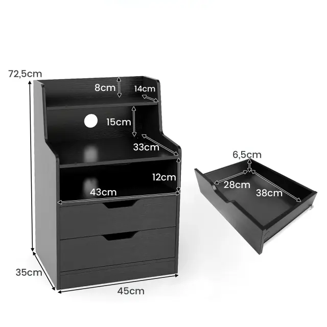 Velik prostor za shranjevanje: 5-stopenjska nočna omarica je vaša idealna rešitev za shranjevanje. Ima zgornjo polico z dvignjenimi zaščitnimi robovi, velik prostor za shranjevanje vaših osebnih predmetov, lahko dostopen odprt prostor za shranjevanje in 2 predala z gladko tekočimi vodili, da bodo vaše stvari lepo urejene.