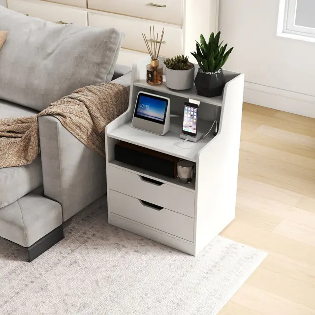 Učinkovita rešitev za polnjenje: Pametno zasnovana nočna omarica ima vgrajeno polnilno postajo z 2 priključkoma za izmenični tok, priključkom USB in priključkom Type-C. Dve kabelski vtičnici zagotavljata, da bo prostor okoli pohištva urejen in brez kabelske gneče.