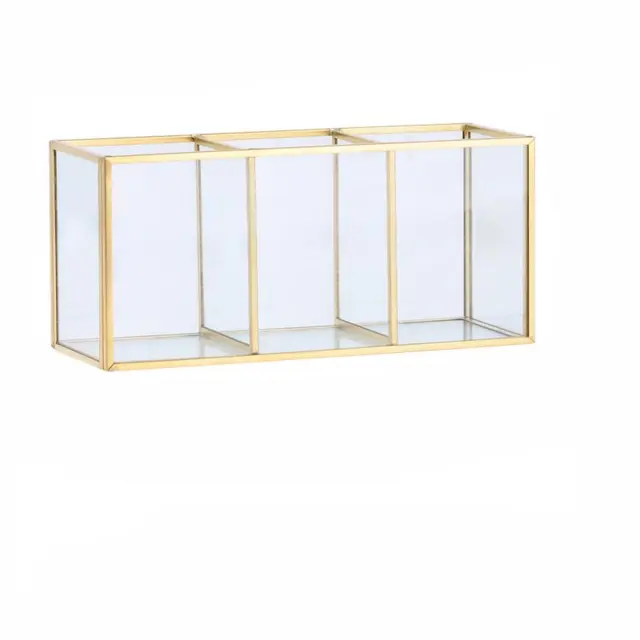 Elegantna rešitev za organizacijo: Ta nordijska minimalistična steklena škatla za shranjevanje ponuja eleganten in učinkovit način za organizacijo vašega prostora. S tremi predelki je popolna za ločevanje in razstavljanje nakita, kozmetike ali pisarniškega materiala. Elegantna steklena zasnova v kombinaciji z medeninastim robom doda pridih prefinjenosti vsakemu prostoru, hkrati pa ohranja vaše stvari urejene in lahko dostopne. Izboljša tako funkcionalnost kot estetiko, zaradi česar je odličen dodatek za toaletne mizice, mize ali pulte. Ta elegantna posoda za shranjevanje pomaga pri pospravljanju, hkrati pa razkazuje vaše predmete s stilom. Popolna rešitev za shranjevanje za tiste, ki iščejo stil in red.