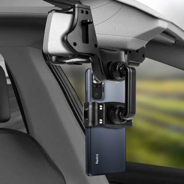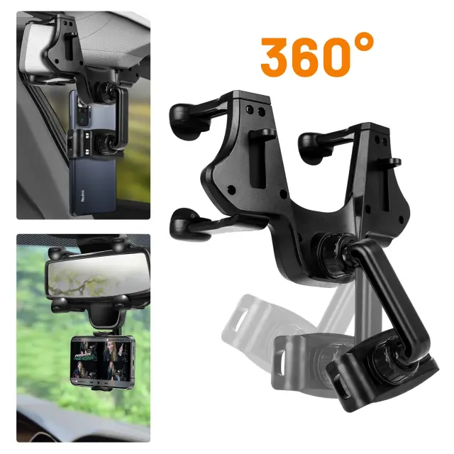 Crno avtomobilsko držalo za pametni telefon LinQ. Pritrdi se na vzvratno ogledalo s 4 nastavljivimi kavlji, da ostane mobilnik v vidnem polju. 360° vrtljiva glava za iskanje najboljšega kota gledanja. Združljiva širina pametnega telefona od 6 do 9,8 cm.