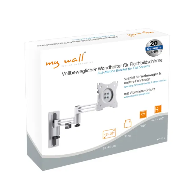 Vrtljiv stenski TV nosilec MyWall HC 1-3L s 3 individualno nastavljivimi spoji je primeren za vgradnjo v avtodome in prikolice.