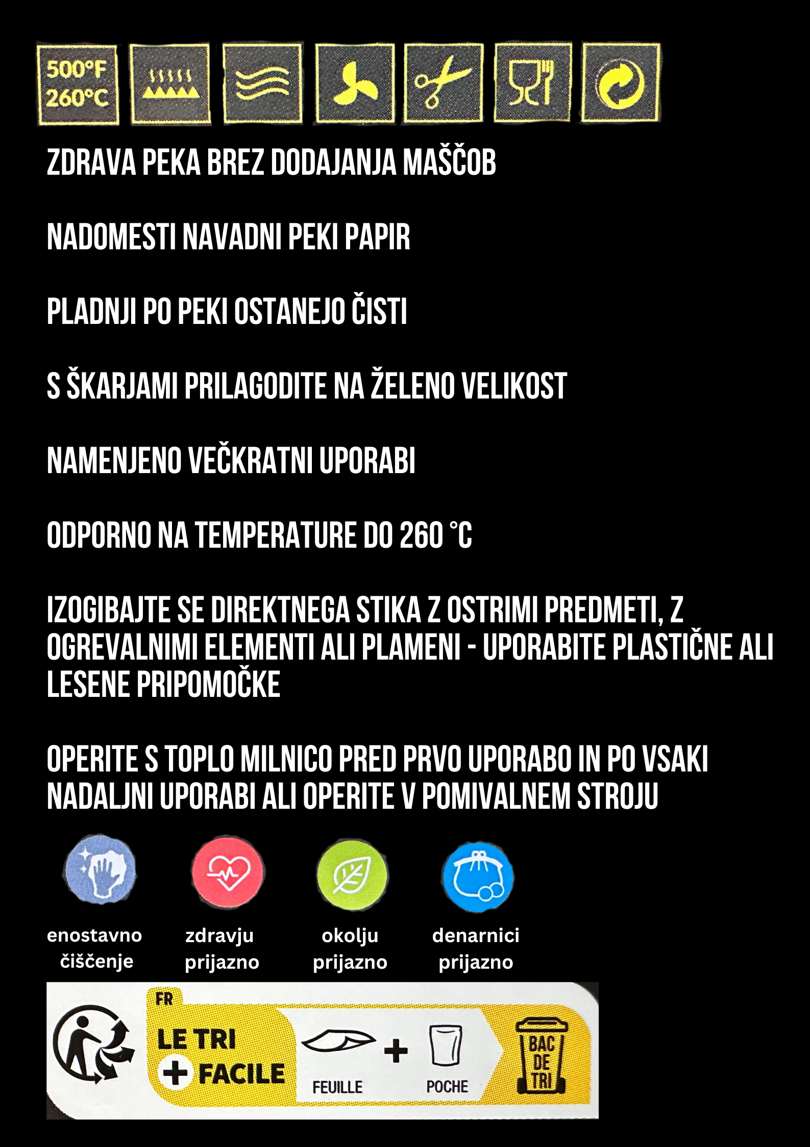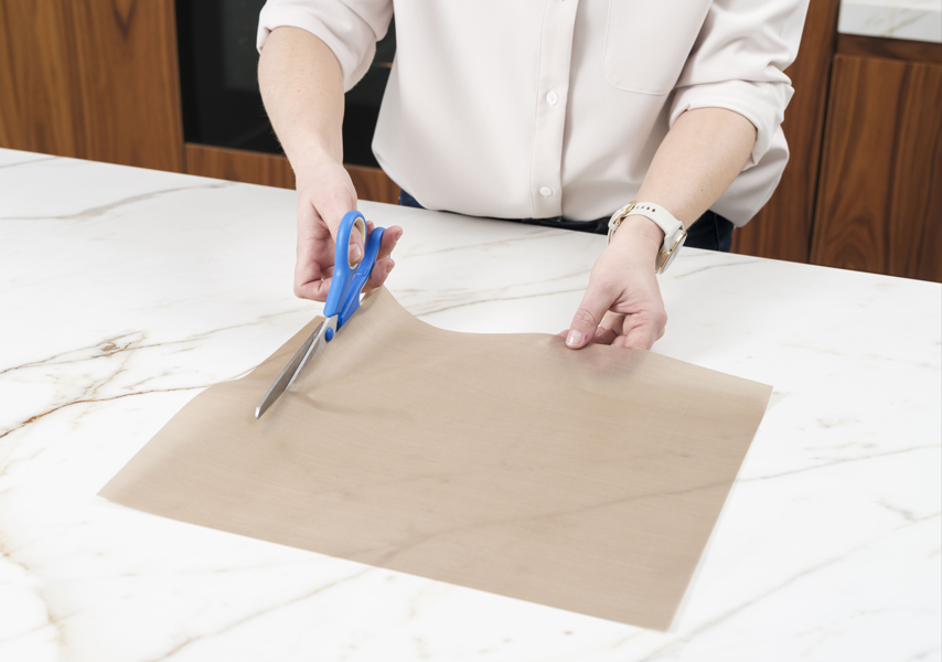 Z uporabo teflonske podloge NoStik prihranite čas pri pripravi, saj ni potrebe po predhodnem mazanju pekača in čiščenju zasušenih ostankov hrane. Izdelek je okolju prijazen, ker omogoča večkratno uporabo, z njegovo pomočjo pa lahko jedi pripravljate na bolj zdrav način. Podlogo lahko enostavno prilagodite želeni velikosti tako, da jo obrežete s škarjami. Čiščenje je preprosto, saj je primerna za pomivalni stroj. Podloga je odporna na vročino do 260 °C. Dimenzija: 33 cm x 40 cm