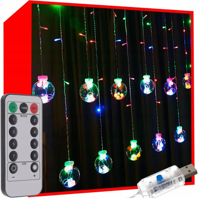 LED KROGLIČNE SVETILKE – ta edinstvena osvetlitev za zavese ima kar 8 različnih načinov osvetlitve, kar ustvari edinstveno in edinstveno dekoracijo vsakega okna, interierja in celo vrta. Imajo različna zaporedja, ki jih je mogoče preklapljati s krmilnikom, pritrjenim na kabel . Svetilke se napajajo preko USB priključka iz električnega omrežja.