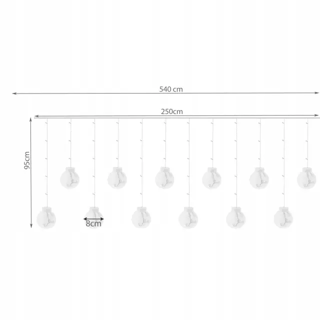 SPECIFIKACIJA – Število načinov: 8; vrsta osvetlitve; LED; svetla barva: večbarvna; število LED: 108; razred vodotesnosti: IP44; voznik: da; napajanje: električno omrežje; moč: 3,6W; napetost: 230V / 31V; premer kroglice: 8 cm; skupna dolžina: 540cm; širina svetlobne zavese: 250 cm; dolžina žleda: 95 cm; teža: 0,464 kg