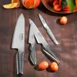Global nož Santoku G-80 združuje prednosti noža s sekiro in kuharskega noža v enem. Kotni vzorec z robnimi zarezami oz. zračnimi mešički zmanjša upor rezila in minimizira prijemanje med sekljanjem in rezanjem živil. Gladke konture in brezšivna konstrukcija iz nerjavečega jekla odpravljajo pasti za hrano in umazanijo ter nudijo vrhunsko varnost in higieno. Rezilo dolžine 18 cm zagotavlja izjemno ostrino in ohranitev robov. Votli ročaji iz nerjavečega jekla so popolnoma uravnoteženi, in zagotavlja odličen oprijem in ravnotežje v roki. Ikonične pike na ročaju nožev predstavljajo sedem vrlin bušida iz tradicionalnega japonskega kodeksa časti samurajev. Rezilo je izdelano iz najboljšega nerjavečega jekla, imenovanega CROMOVA 18 (krom, molibden in vanadij). Nož pomijte ročno. Zasnovan za levičarje ali desničarje