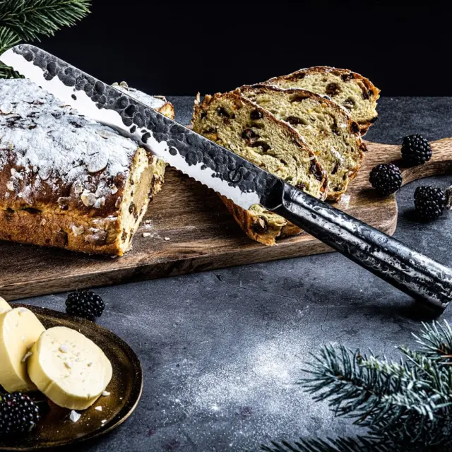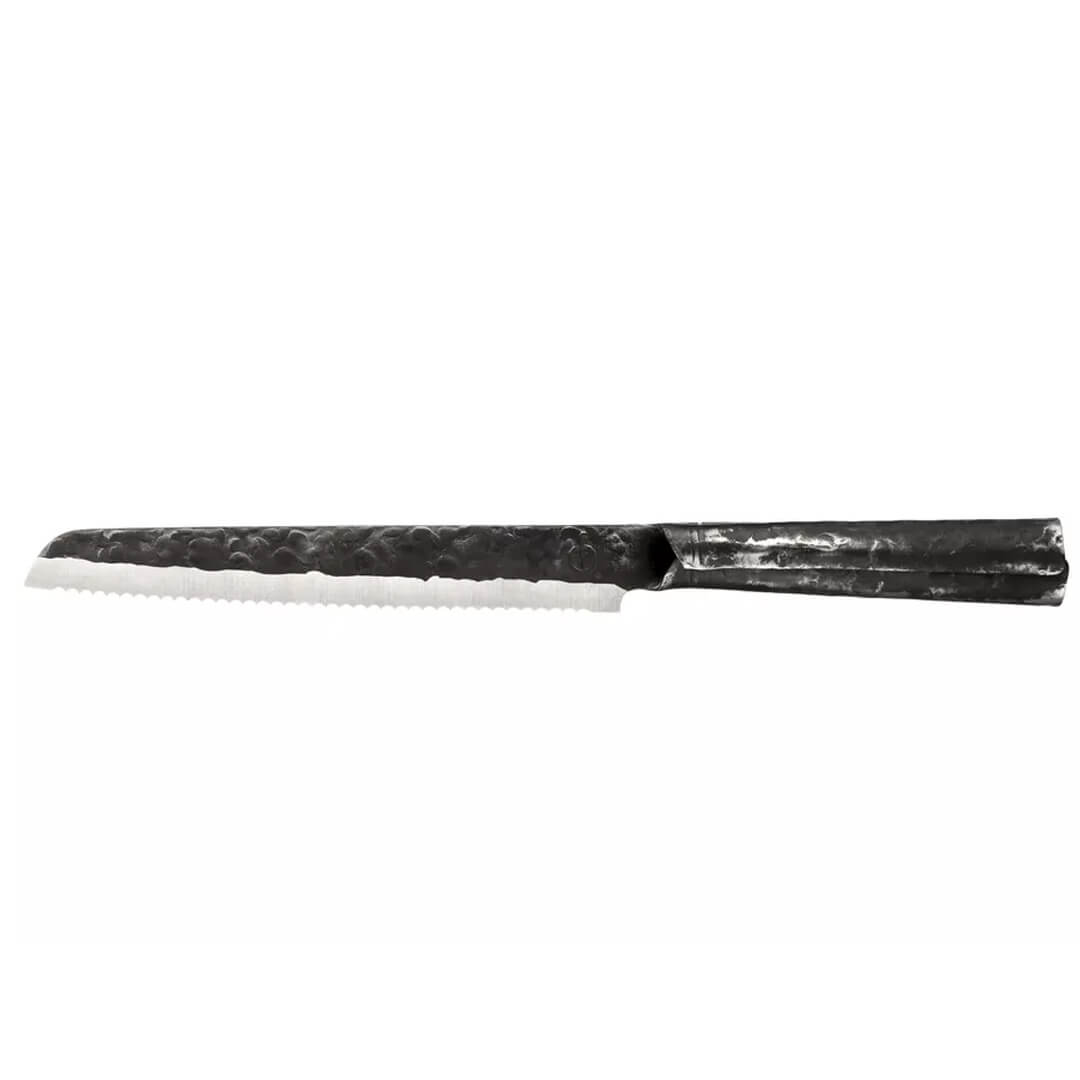 Nož Brute je posebej zasnovan za rezanje kruha ter odličen za rezanje večje zelenjave ali sadja, kot so melona, buča ali ananas. Ima dolgo, nazobčano rezilo dolžine 20 cm. Oblika rezila sledi tradiciji evropske kuhinje, kakovost in vzdržljivost pa zagotavlja japonsko jeklo 440C s trdoto 58 Rockwell. Nož iz serije Brute je ročno kovano, unikatno delo. Njegov značilen, grobo obdelan videz poudarja ročno izdelavo in daje nožu surov, avtentičen značaj. Rezilo je debelo 2 mm in brušeno pod kotom 18°. Ročaj iz valjanega nerjavečega jekla s posebno odprtino dodaja edinstven pečat, hkrati pa zagotavlja trpežnost, lahkotnost in udobno uporabo. Skupna dolžina noža z ročajem je 34 cm. Nož je pakiran v luksuzni leseni embalaži, zato je odlično darilo ali investicija v lastno kuhinjo. Dimenzija embalaže: 39,3x9,3x4 cm