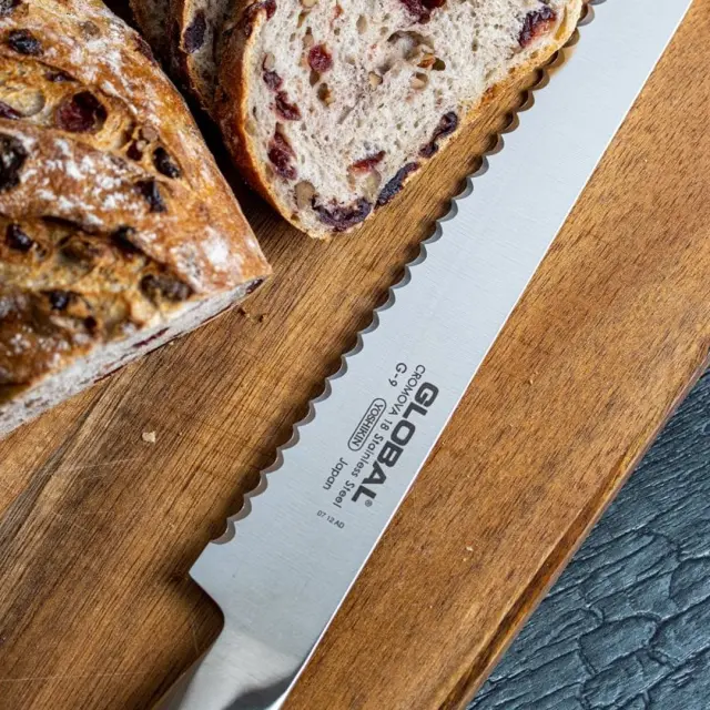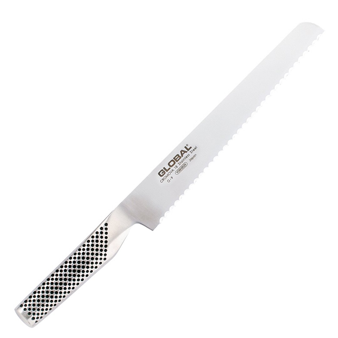 Nož za kruh Global G-9 z 22-centimetrskim nazobčanim rezilom omogoča enostavno rezanje tudi sveže pečenega in največjega hlebca kruha. Prav tako je primeren za rezanje čvrste skorje, na primer na pečeni svinjski krači ter za rezanje zelenjavnih gomoljev. Poudarek serije Global je na ergonomiji in optimalni uporabnosti, zaradi česar je linija priljubljena tako pri profesionalnih kot amaterskih kuharjih. Njegova teža olajša dolgotrajno delo brez utrujenosti. Nož dolžine 34 cm je izdelan iz kakovostnega nerjavečega jekla brez spojev in zato ultra higienski. Global noži predstavljajo izjemno ostrino, najboljšo japonsko izdelavo in optimalno simbiozo funkcionalnosti in elegantnega dizajna. Po uporabi ga ročno pomijte in čim prej posušite.
