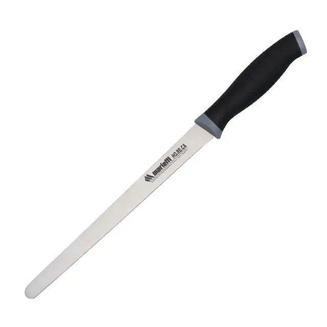 Rezilo noža za pršut iz linije LADY je izdelano iz nerjavečega jekla (50CRMOV14 AISI 420) z visoko trdoto 54/55 HRC, ki ohranja njegovo elastičnost in prilagodljivost ter zagotavlja vedno popolne reze. Ergonomsko oblikovan ročaj je zaključen z nedrsečim in nestrupenim gumijastim termopolimerom, ki je primeren tudi za pomivanje v pomivalnem stroju. Dolžina rezila je 26 cm, skupna dolžina noža z ročajem pa 44 cm.