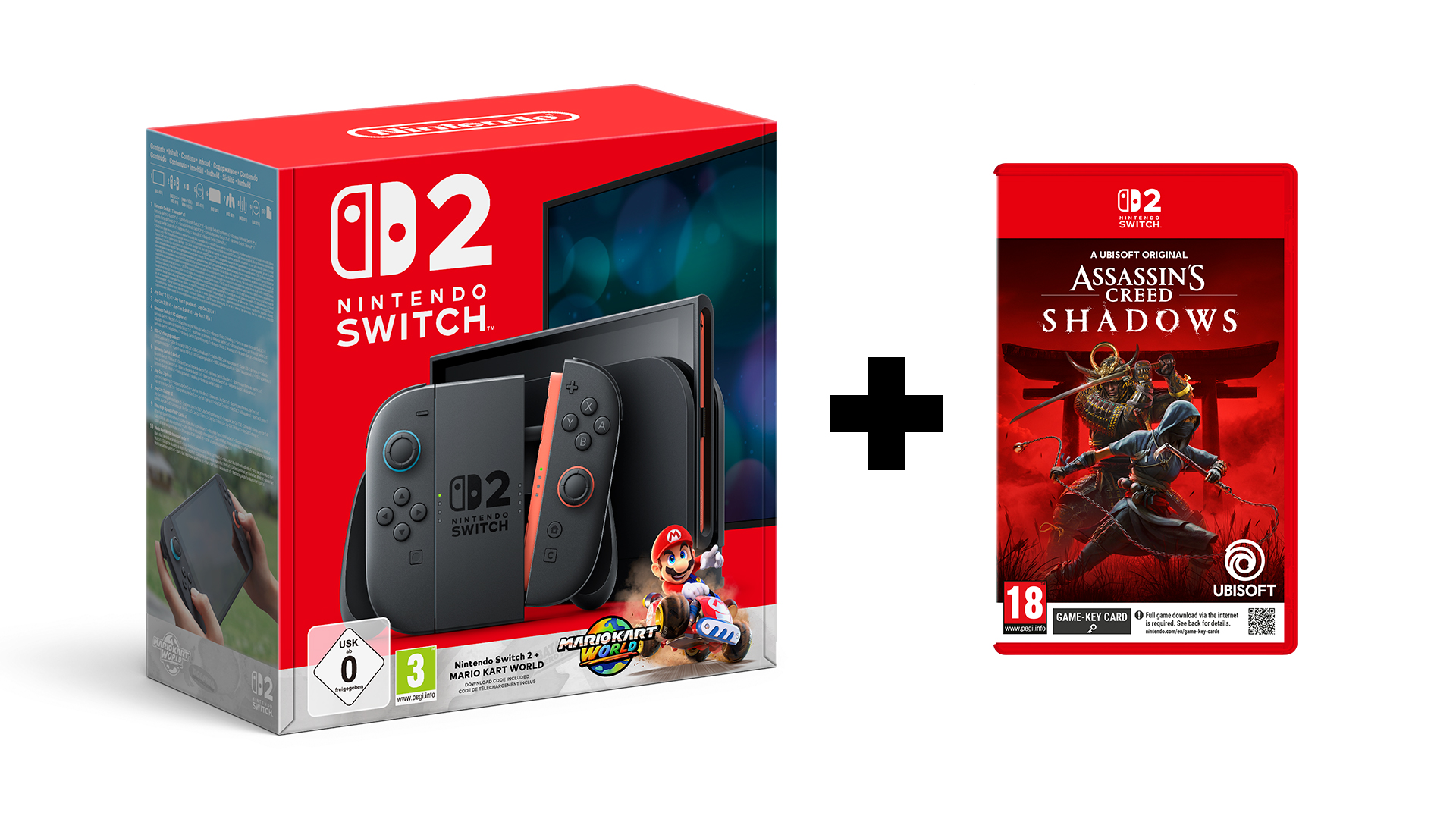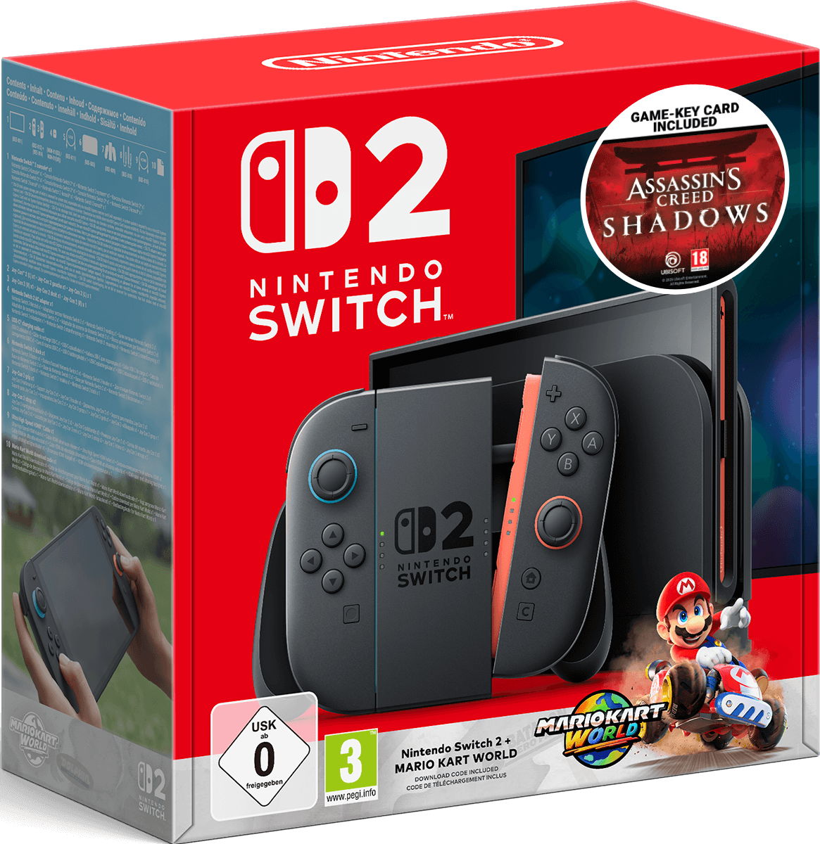 Začni svojo avanturo z Nintendo Switch 2 s tem paketom, ki vključuje konzolo in poln prenos igre Mario Kart World, ekskluzivne za Nintendo Switch 2. Nintendo Switch 2 je naslednja evolucija sistema Nintendo Switch — polna nadgradenj in zabavnih načinov za povezovanje ter skupno igranje! Doživi Assassin’s Creed Shadows na povsem nov in edinstven način z Nintendo Switch 2, ne glede na to, ali si doma ali na poti! Odkrij posebne funkcije, prilagojene različici za Nintendo Switch 2, vključno z intuitivnim upravljanjem na zaslonu na dotik za menije in navigacijo po zemljevidu ter tudi za gradnjo skrivališča. OBVLADAJ NAJGLOBLJE MEHANIZME PRIKRITOSTI V SERIJI IN SE BOJUJ V SUROVEM BOJU Igraj kot Naoe, bistroumna šinobi bojevnica, in uporabi svetlobo, zvok ter sence, da se izogneš zaznavi. Infiltriraj sovražna oporišča z mnogimi parkour možnostmi, vključno z novo vrvjo s kavljem, zamoti stražarje s šurikeni ali dimnimi bombami in eliminiraj tarče s skritim rezilom. Kot samuraj Yasuke uporabi tihe napade z lokom ali sproži uničujoče kombinacije v bližnjem boju s katano ali naginato. Preklapljaj med tema dvema junakoma, da prilagodiš svojo strategijo, in doživi fevdalno Japonsko skozi dva povsem različna pristopa – prikritost in moč, sence in jeklo. POGLOBI SE V OČARLJIV SVET ASSASSIN'S CREED SHADOWS Stopi v fevdalno Japonsko kot še nikoli doslej! Od veličastnih grajskih mest do spokojnih svetišč in prostranega podeželja – Assassin’s Creed Shadows ponuja osupljiv odprti svet, kjer dinamični letni časi, spreminjajoče se vreme in uničevanje okolja vplivajo na tvojo taktiko. Za popolno potopitev v igro jo doživi tudi z japonsko sinhronizacijo. SVETOVNA USPEŠNICA Ne glede na to, ali si izkušen igralec serije Assassin’s Creed ali novinec, te fevdalna Japonska pričakuje skupaj s skupnostjo milijonov igralcev!