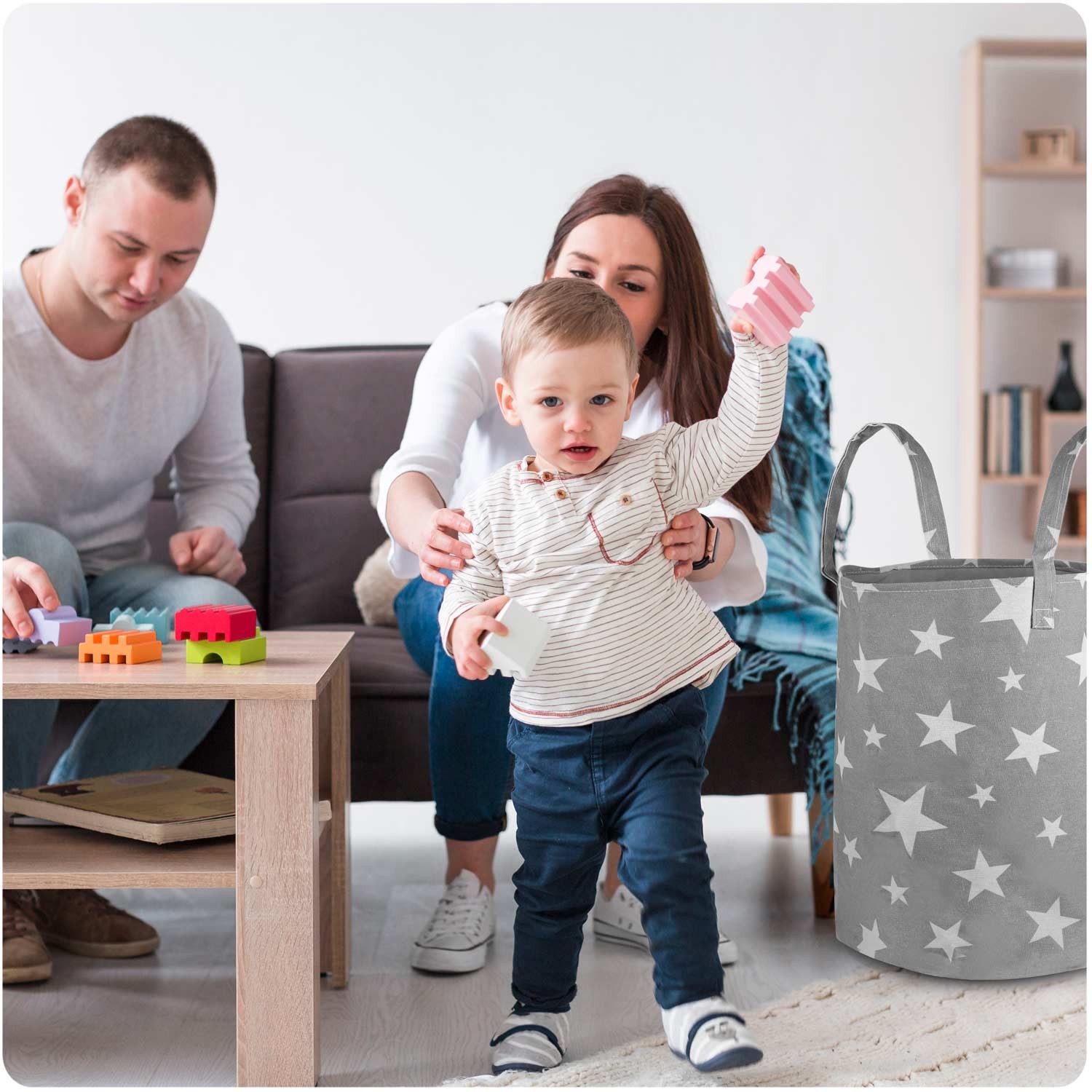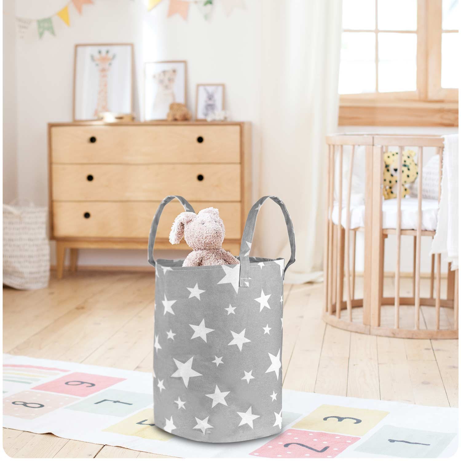 Keep your child's room tidy and stylish with the Nukido Toy Basket in Gray with Stars. This spacious and durable toy storage solution is crafted from high-quality cotton, ensuring it withstands the daily wear and tear of playtime. Its practical free-standing design allows for easy access and organization, making cleanup a breeze. Not only does it offer a large capacity for toys, but its charming star pattern also adds a decorative touch to any nursery or playroom. Choose Nukido for a thoughtful and functional addition to your child's space!