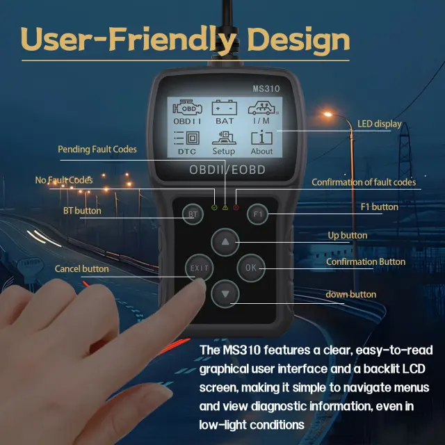Uporabniku prijazna zasnova: Čitalnik kod napak ima jasen in lahko berljiv grafični uporabniški vmesnik ter osvetljen LCD zaslon, ki olajša krmarjenje po menijih in prikazovanje diagnostičnih informacij tudi pri šibki svetlobi. Njegova kompaktna in ergonomska oblika zagotavlja udobno rokovanje.
