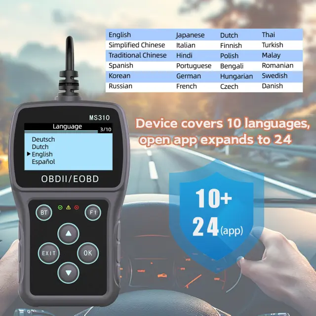 Široka združljivost: Čitalnik kod napak podpira vsa vozila, prodana v EU od leta 2001 (bencin) in 2004 (dizel), ki so združljiva s standardnimi protokoli OBD2/EOBD/JOBD.