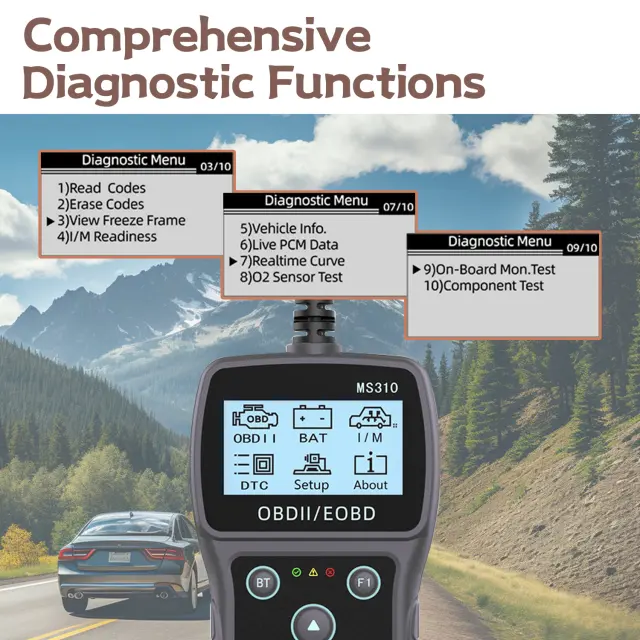 Obsežne diagnostične funkcije: Zmogljiv skener lahko naredi več kot le branje in brisanje kod napak. Diagnostično orodje omogoča tudi dostop do podatkovnih tokov v živo, pripravljenosti I/M, podatkov o zamrznjeni sliki, odčitkov senzorja O2, spremljanja napetosti akumulatorja in več, kar omogoča poglobljeno diagnostiko vozila.