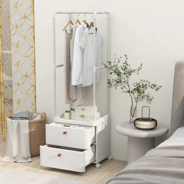 S tem večnamenskim stojalom za oblačila z vrhunskim zaključkom organizirajte oblačila v slogu. Ima vodilo za oblačila s 4 odstranljivimi kavlji, sredinsko polico in 2 izvlečna predala z 1 pregrado, ki omogočajo enostaven dostop do oblačil in dodatkov. Robusten kovinski okvir z ojačanimi prečkami zagotavlja stabilnost in varnost za vse vaše predmete. S 4 univerzalnimi kolesi z gladkim tekom, od katerih sta 2 za dodatno stabilnost zaklenjeni, lahko stojalo brez težav premikate in pritrjujete. Nadgradite svoj bivalni prostor s to vsestransko omaro, ki združuje police za shranjevanje, obešalnike in predale za urejeno in elegantno rešitev za shranjevanje.