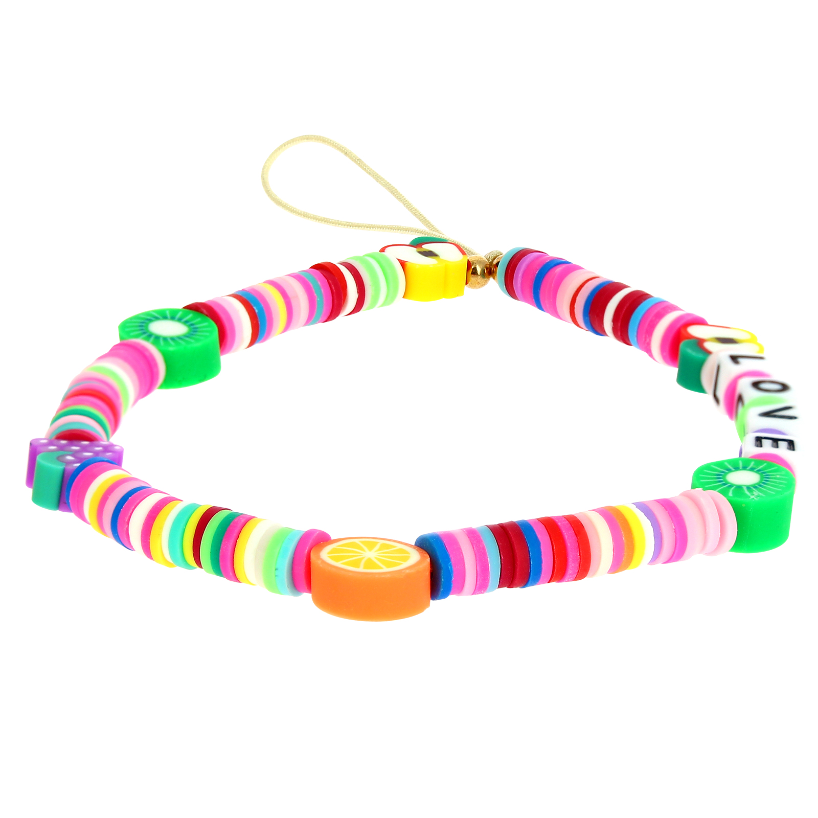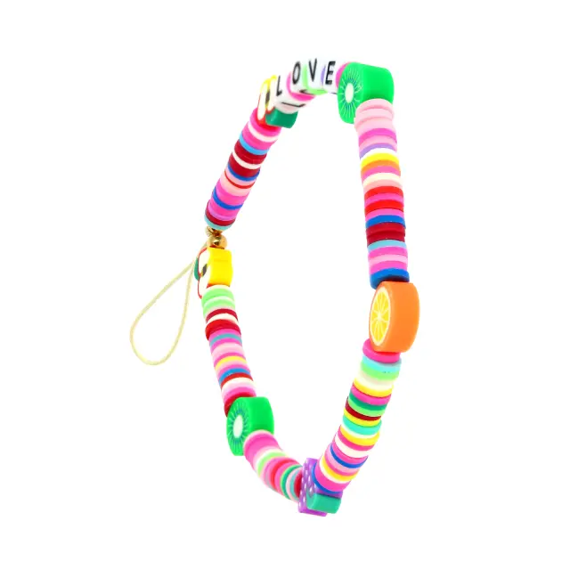 Telefonski nakit, zapestnica z napisom 'LOVE', iz kolekcije Lovely. Izvirni doma izdelan nakit z mešanico večbarvnih Heishi biserov, črk in sadja. Barvita in zabavna zapestnica za držanje pametnega telefona na zapestju. Združljivo z vsemi etuiji in zaščitnimi pokrovi.